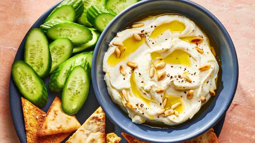 Un bol de feta fouettée garni de pignons de pin