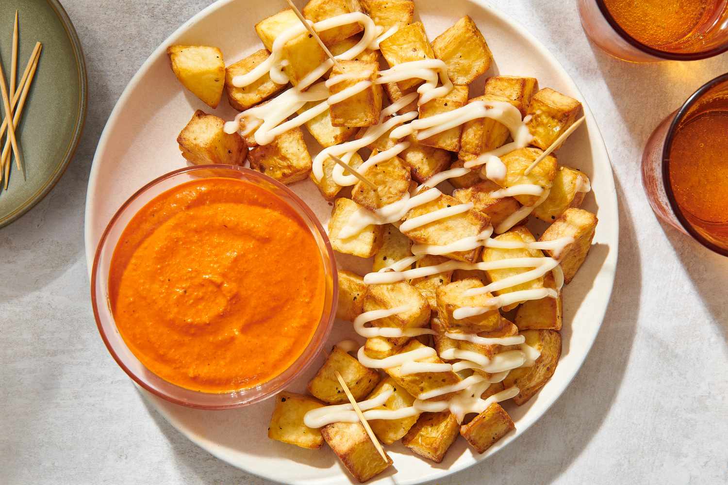 Je préfère servir mes patatas à la mode tapas, avec des cure-dents plantés dans quelques morceaux de pommes de terre et la sauce bravas à côté pour tremper. Cela aide à garder les morceaux de pommes de terre croustillants plus longtemps. Mais il n'est pas rare de plonger les pommes de terre dans la sauce jusqu'à ce qu'elles soient complètement enrobées. Pour la version Cadillac, n'hésitez pas à arroser d'aïoli à l'ail sur le dessus. C'est riche, mais très sexy, comme la plupart des choses espagnoles.