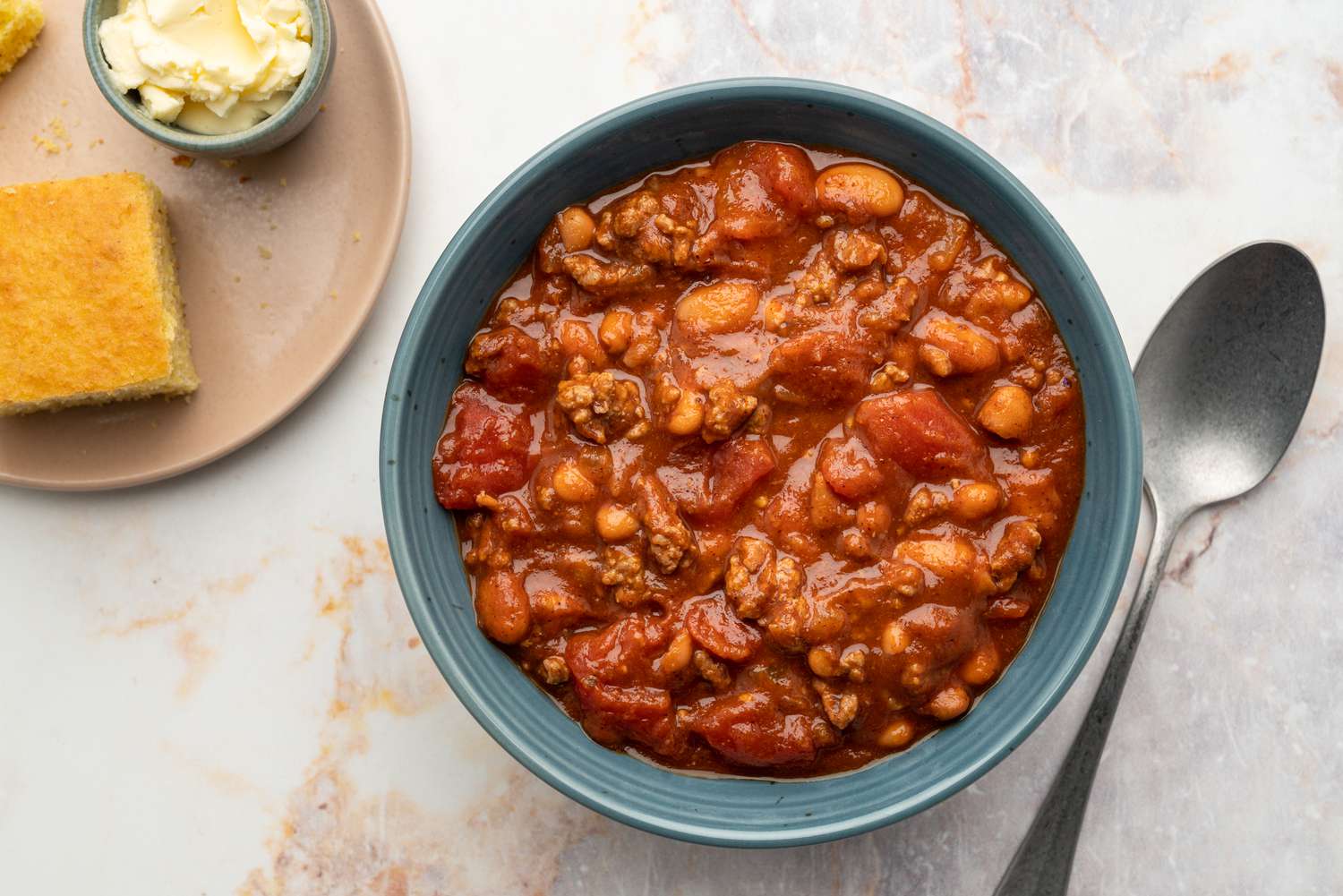 Créez un dîner copieux en famille avec cette recette facile de chili à la mijoteuse. Réalisé avec du bœuf haché maigre, des tomates et des haricots pinto, il est rapide à préparer et cuit dans votre mijoteuse toute la journée, donc le dîner sera prêt quand vous l'êtes. Servez le chili dans des bols chauds avec un accompagnement de pain de maïs chaud et de beurre pour un repas complet.