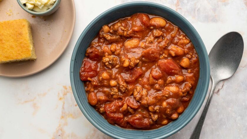 Créez un dîner copieux en famille avec cette recette facile de chili à la mijoteuse. Réalisé avec du bœuf haché maigre, des tomates et des haricots pinto, il est rapide à préparer et cuit dans votre mijoteuse toute la journée, donc le dîner sera prêt quand vous l'êtes. Servez le chili dans des bols chauds avec un accompagnement de pain de maïs chaud et de beurre pour un repas complet.