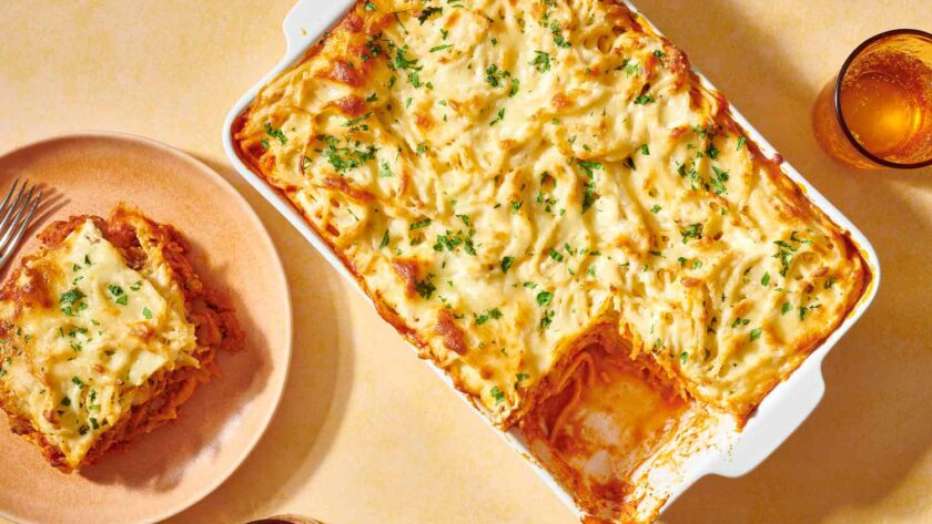 Les différences significatives entre cette casserole de nouilles et la lasagne résident dans la rapidité avec laquelle la sauce se prépare et la variation des couches. De plus, les spaghettis sont traités comme une carbonara pour des moments crémeux et fromagers. Nous utilisons une sauce vodka et des tomates séchées au soleil dans cette recette au lieu de marinara, car nous aimons la façon dont la sauce interagit avec la couche "carbonara", rendant le plat encore plus décadent pour un repas douillet pendant les mois d’hiver.