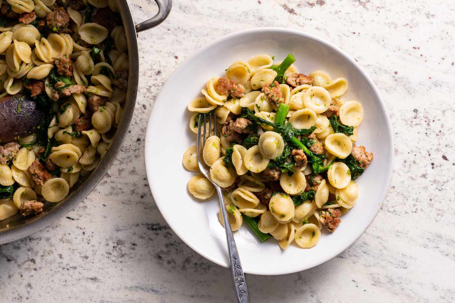 Les orecchiette avec saucisse et brocoli-rave viennent à l'origine des Pouilles, la partie inférieure de la botte qu'est l'Italie. Dans ce plat, les pâtes orecchiette ("petites oreilles" en italien) agissent comme de petites mitaines qui retiennent la sauce à la saucisse italienne et au brocoli-rave. Des orecchiette sèches sont disponibles dans les épiceries bien approvisionnées et les marchés italiens. Utilisez une autre petite pâte en forme de tasse comme des cavatelli ou des conchiglie (coquillages moyens) si vous ne trouvez pas d'orecchiette.