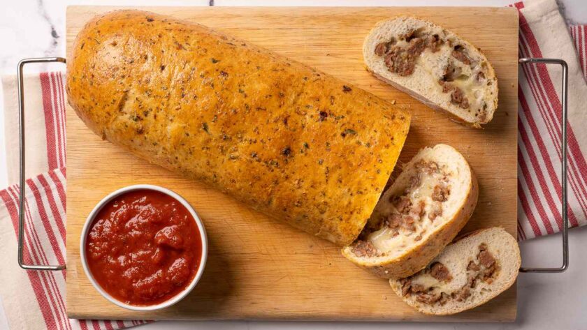 Pour servir, il suffit de couper le roulé de saucisse en tranches et de le plonger dans une sauce marinara chaude. Le résultat est un pain apéritif unique (qui fait aussi un excellent plat principal ou accompagnement) que vos amis et votre famille apprécieront. En fait, ils pourraient même se disputer pour savoir qui aura la dernière tranche.