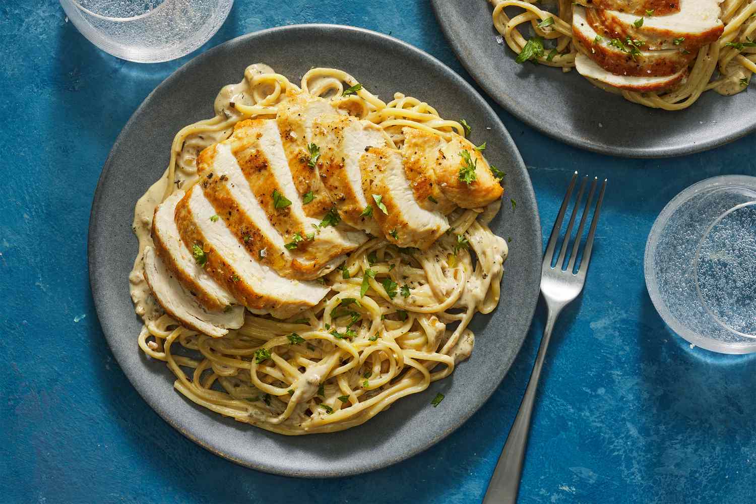 A small plate with creamy pasta, with a cutting board of sliced chicken breast, next to a skillet of more pasta tossed in cream sauce