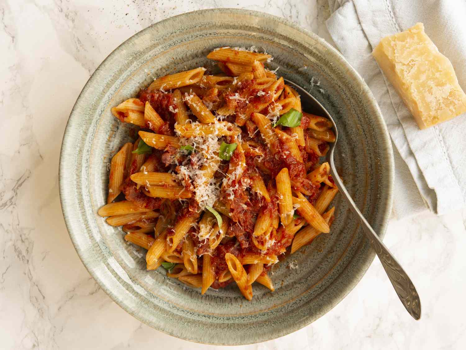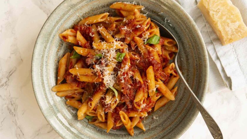 • Ici, la sauce est servie avec des penne, mais vous pouvez également utiliser des spaghetti ou des bucatini selon vos envies.