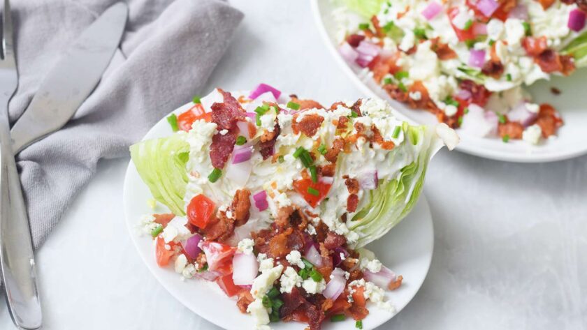 Une salade de wedge classique est le début ou l'accompagnement parfait d'un dîner dans un steakhouse, d'un barbecue ou d'un repas en quatre services. Chargez un simple quartier de laitue iceberg avec une vinaigrette au fromage bleu fait maison, du bacon émietté, des tomates hachées et des oignons marinés acidulés. C'est d'une élégance simplissime, et c'est une méthode appréciée pour ajouter de l'acidité et des légumes à un repas riche.