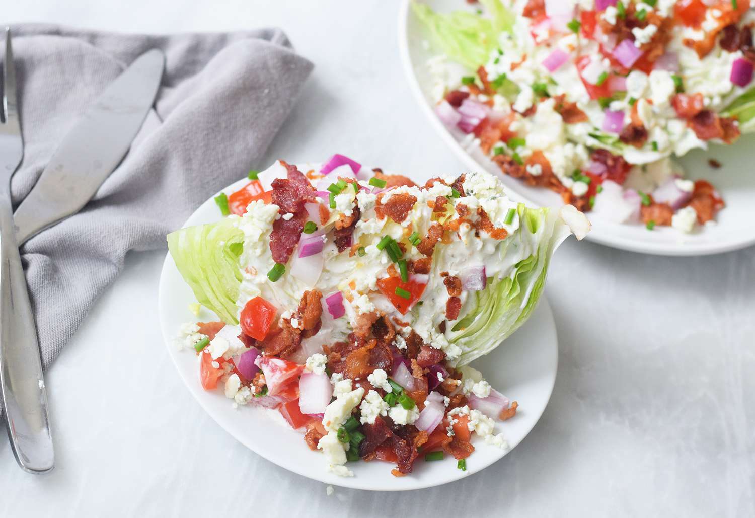 Garnissez les quartiers de laitue iceberg avec la vinaigrette au fromage bleu, puis ajoutez les tomates, les oignons marinés et le bacon émietté. Terminez par des ciboulettes hachées et servez immédiatement.