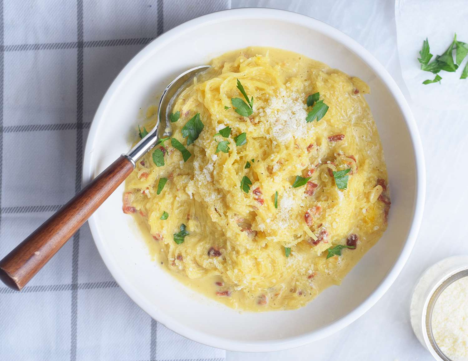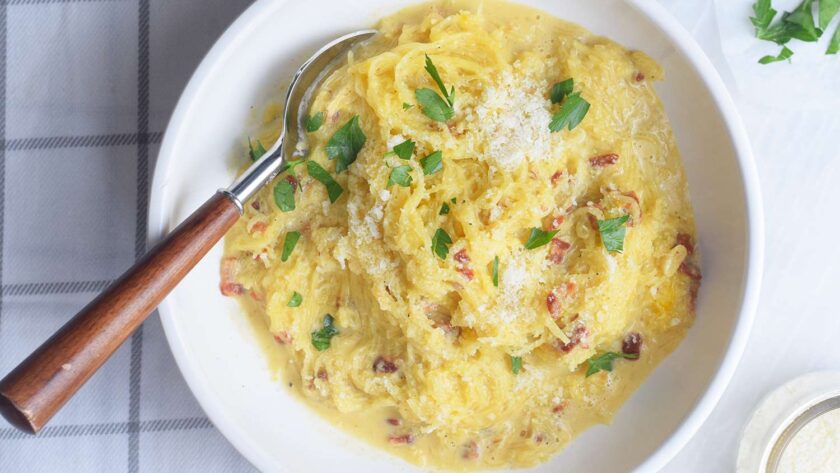 La courge spaghetti carbonara reprend toutes les délicieuses saveurs de la carbonara crémeuse aux lardons, sans les glucides supplémentaires. Vous ne pourrez plus vous arrêter de manger cette "pasta", mais étant donné qu'elle est adaptée au régime paléo et super facile à préparer, vous n'avez pas à le faire !
