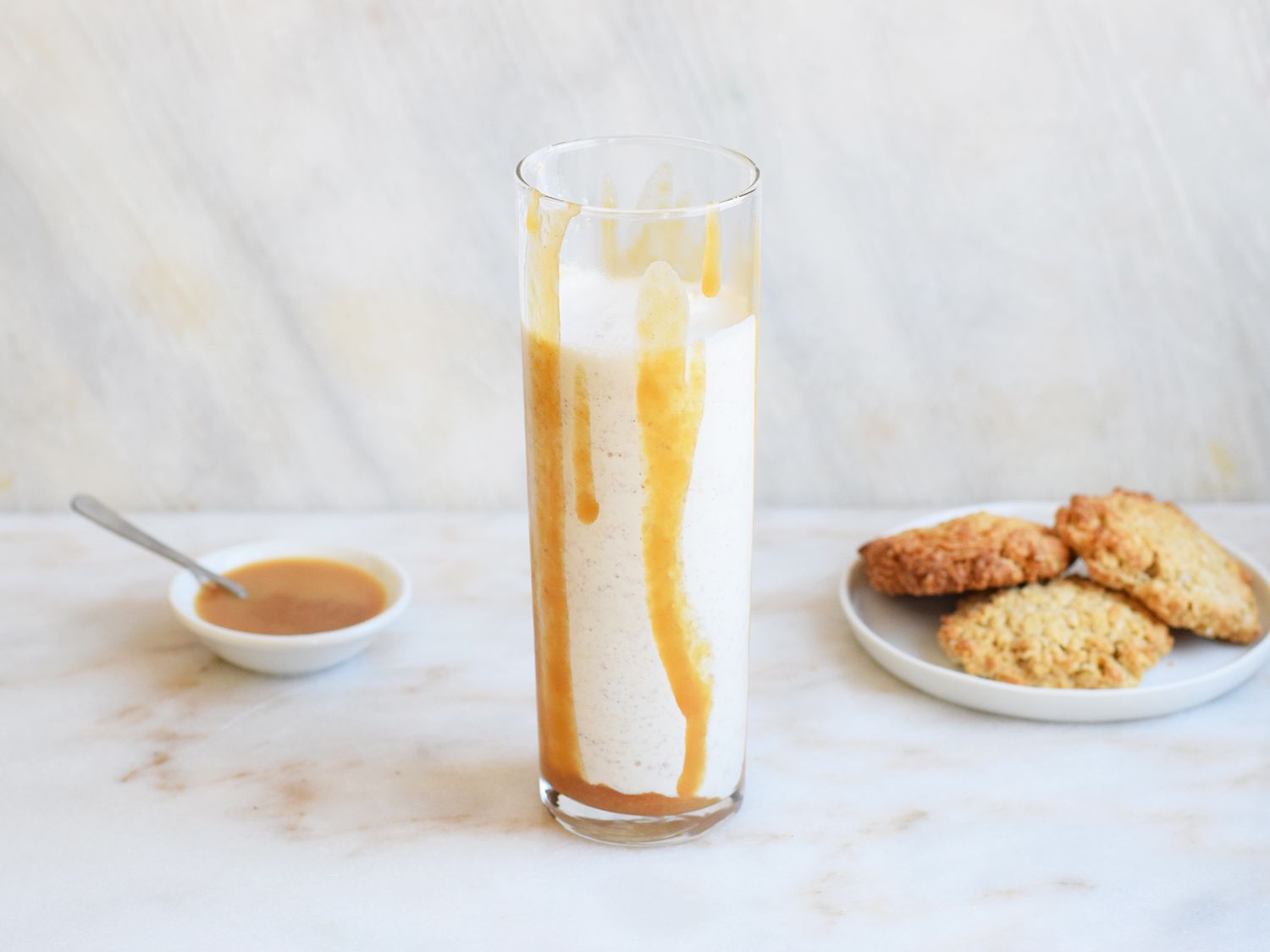 Si vous souhaitez vraiment passer au niveau supérieur, garnissez-le de crème fouettée végétalienne, de biscuits écrasés et de plus de sauce caramel. Nous avons inclus des liens vers toutes les recettes nécessaires pour préparer les biscuits, la sauce caramel et le lait d'avoine maison, mais vous pouvez aussi acheter tous ces ingrédients en magasin. Vous pouvez également le faire avec des ingrédients non végétaliens. C'est un délicieux milk-shake dans tous les cas.