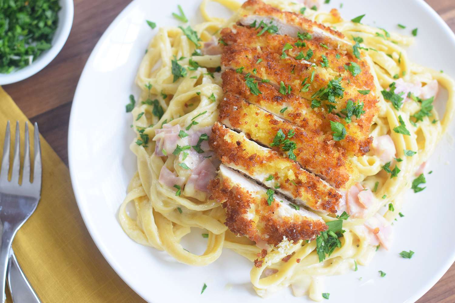 7. Placez une portion de pâtes sur chaque assiette et garnissez avec une ou plusieurs tranches de poulet. Servez immédiatement avec plus de persil haché.