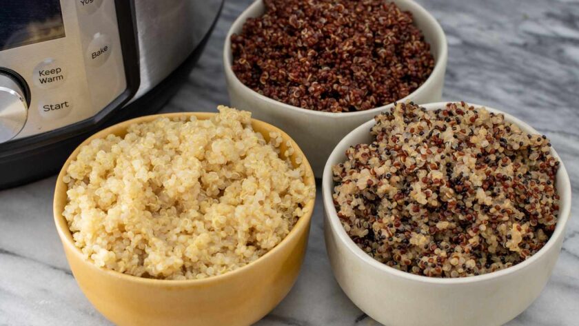 Cette recette nécessite du quinoa blanc classique, mais il est facile de l'adapter avec d'autres variétés. Le quinoa tricolore et rouge nécessite une minute de cuisson supplémentaire, et le quinoa noir nécessite deux minutes de plus. Les quantités d'eau et de sel ainsi que le temps de libération restent les mêmes que pour la variété blanche.