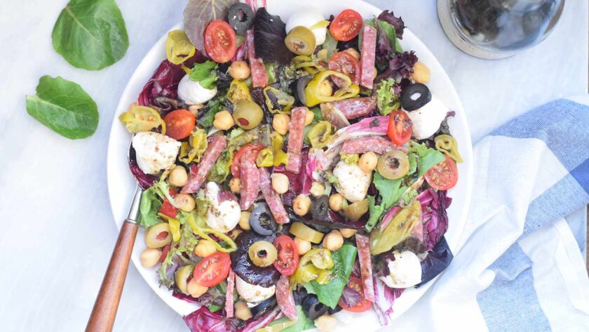 Placez les légumes et le radicchio déchiré dans un grand saladier, puis ajoutez le salami coupé, les tomates cerises, les olives, les pepperoncini, les pois chiches et le fromage mozzarella. Mélangez tous les ingrédients pour que les garnitures soient uniformément réparties.