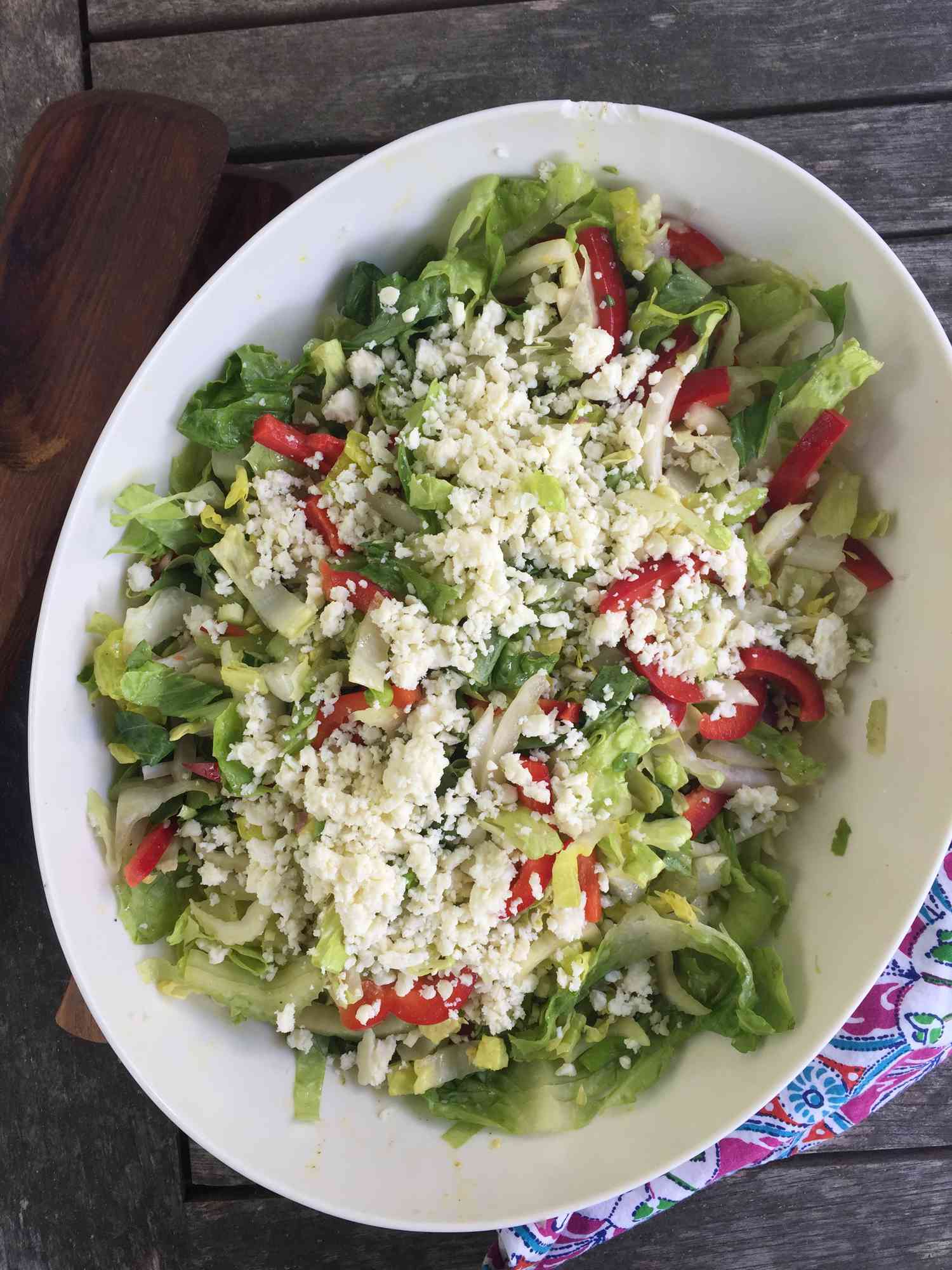 Dans un grand bol, mélanger la laitue, le céleri, l'oignon, le poivron, puis ajouter la vinaigrette et mélanger pour combiner. Transférer dans un plat de service et saupoudrer de queso cotija.