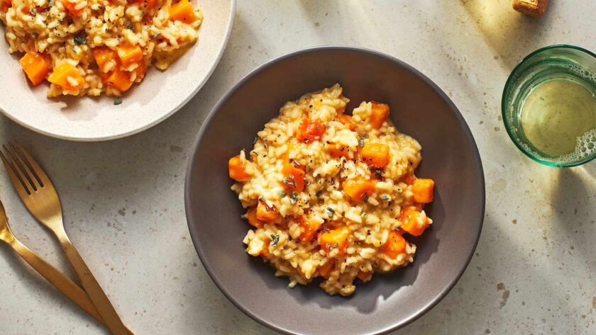 L'ajout de courge butternut au risotto offre des saveurs sucrées et salées à la fois satisfaisantes et ludiques. Bien que la plupart des morceaux de courge conservent leur texture, certains se décomposeront naturellement. Le résultat final est un plat coloré exceptionnellement crémeux.
