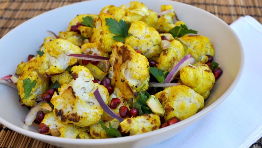 Les fleurettes de chou-fleur deviennent rapidement croustillantes, tendres et légèrement carbonisées dans un four chaud. Des graines de grenade fraîches ajoutent une acidité rafraîchissante et une texture croquante, tandis que l'oignon rouge apporte une belle note épicée. Les pistaches ajoutent un croquant délicieux, et le persil frais ainsi que le citron gardent le tout léger et semblable à une salade. Ce n'est pas parce qu'il fait froid que vos plats ne peuvent pas avoir un goût frais et éclatant. N'hésitez pas à servir avec du poulet rôti ou un steak, si vous souhaitez renforcer votre plat. (Jeu de mots intentionnel !)