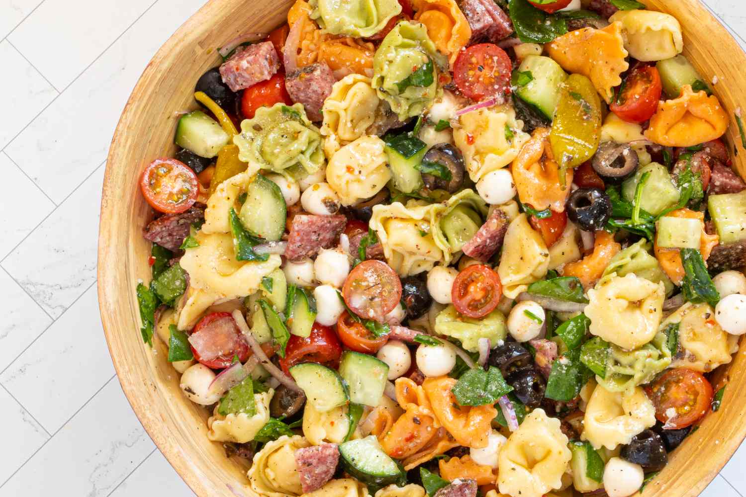 Dans un grand bol, combinez les tortellini, 2 tasses de tomates cerises (coupées en deux), 6 à 8 onces de salami ou de jambon, 1 tasse de concombre (coupé en dés), 1 tasse d'épinards (frais, grossièrement hachés), 1/2 tasse d'oignon rouge (coupé en fines tranches), 1/2 tasse d'olives noires (coupées ou coupées en deux), et 4 à 6 onces de mozzarella. Pliez délicatement les ingrédients ensemble, puis assaisonnez selon votre goût avec 1/4 cuillère à café de poivre noir et 1 pincée de sel casher. Ajoutez 1/2 tasse de pepperoncini et basilic, si désiré. Réfrigérez la salade jusqu'à environ une heure avant de servir.