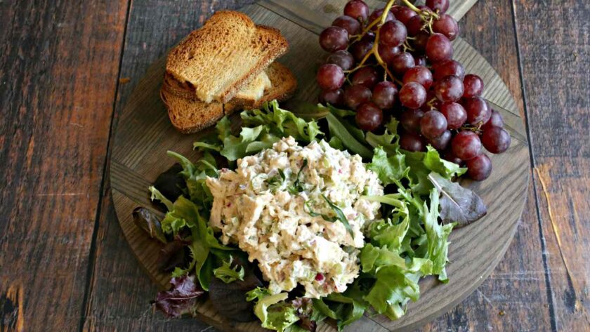 Servir la salade de poulet sur un lit de mélange de salades avec des crackers ou du pain grillé et des raisins frais sans pépins.