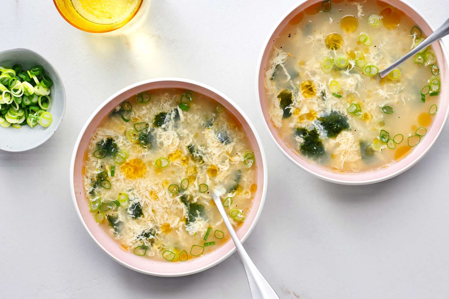 Garnissez la soupe aux œufs et algues avec des oignons verts hachés et un filet d'huile de sésame.