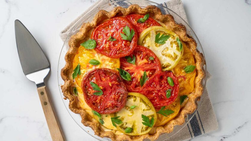 La tarte aux tomates fraîches est une spécialité du Sud, idéale pour un déjeuner ou un brunch estival. C'est un excellent moyen d'utiliser l'abondance des tomates anciennes fraîches du jardin et des herbes disponibles pendant les mois d'été. Choisissez des tomates de différentes couleurs pour un arc-en-ciel sur le dessus de votre tarte.